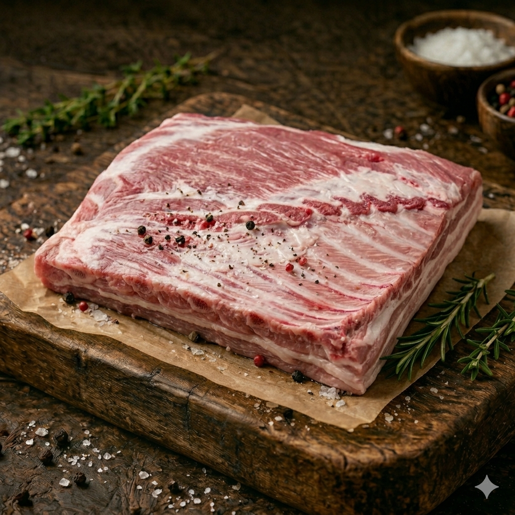 Stegeside fra dansk Berkshire gris med en dybere smag og god fedtstruktur – ideel til sprød flæskesteg og klassiske retter.