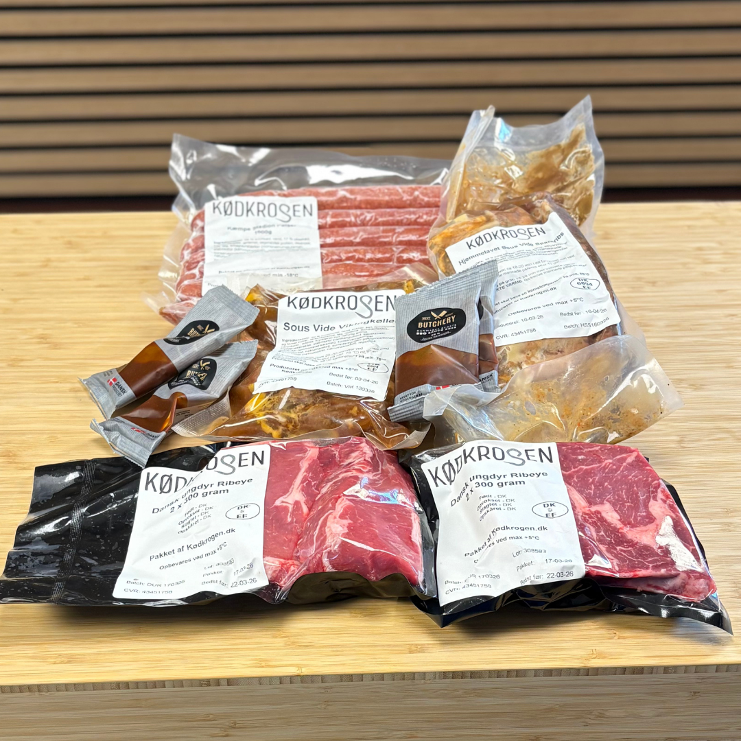 Fantastisk lækker kasse med ca. 4 kg lækkerier i topkvalitet – klar til grill, ovn eller pande.