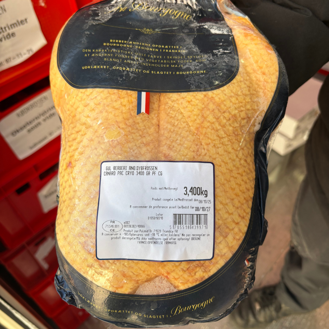 Fransk gul Berberiand på ca. 3,4 kg – opdrættet og slagtet i Bourgogne. Kendt for ekstra sprød hud og fyldig andesmag. Perfekt til juleaften!